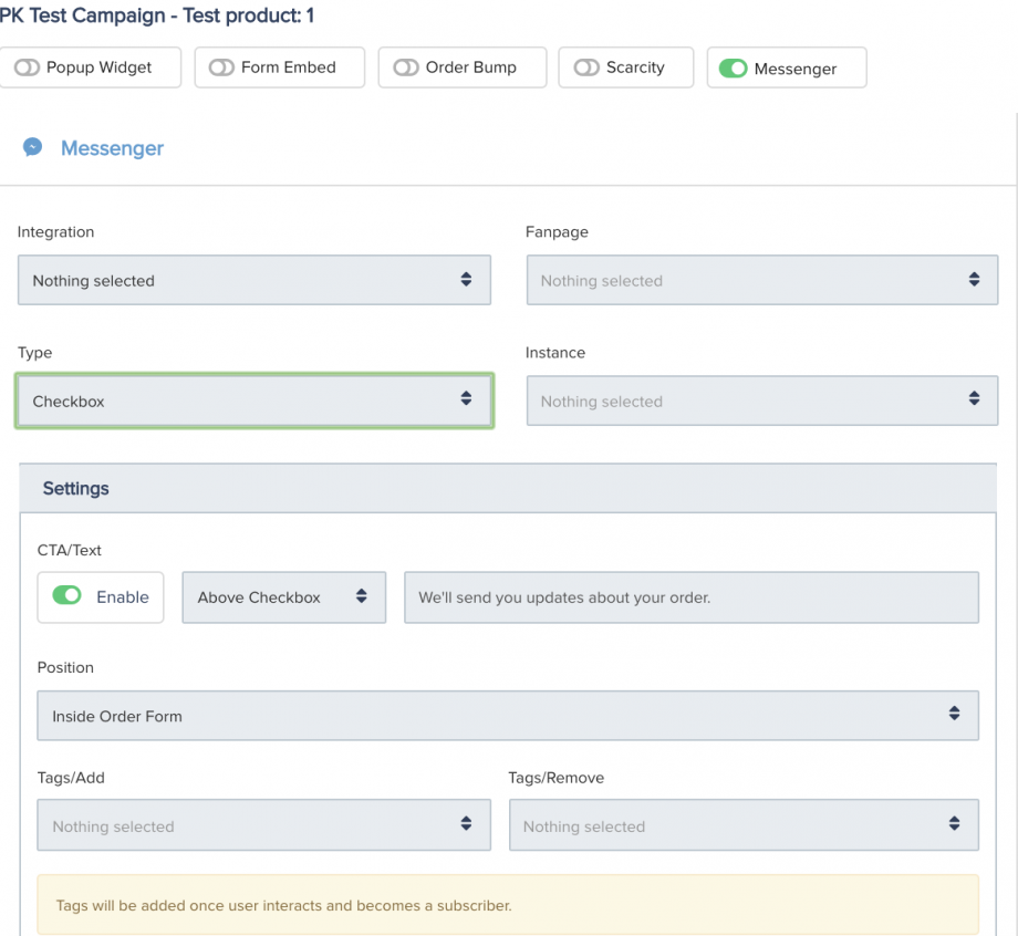 With the SegMate integration, vendors can integrate with Fan pages to add various types of messenger bots to their PayKickstart checkouts.