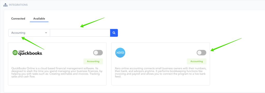 First, you’ll need to integrate on your main integration page. To do so, click on the dropdown Menu and select Accounting or use the search bar to locate Xero.