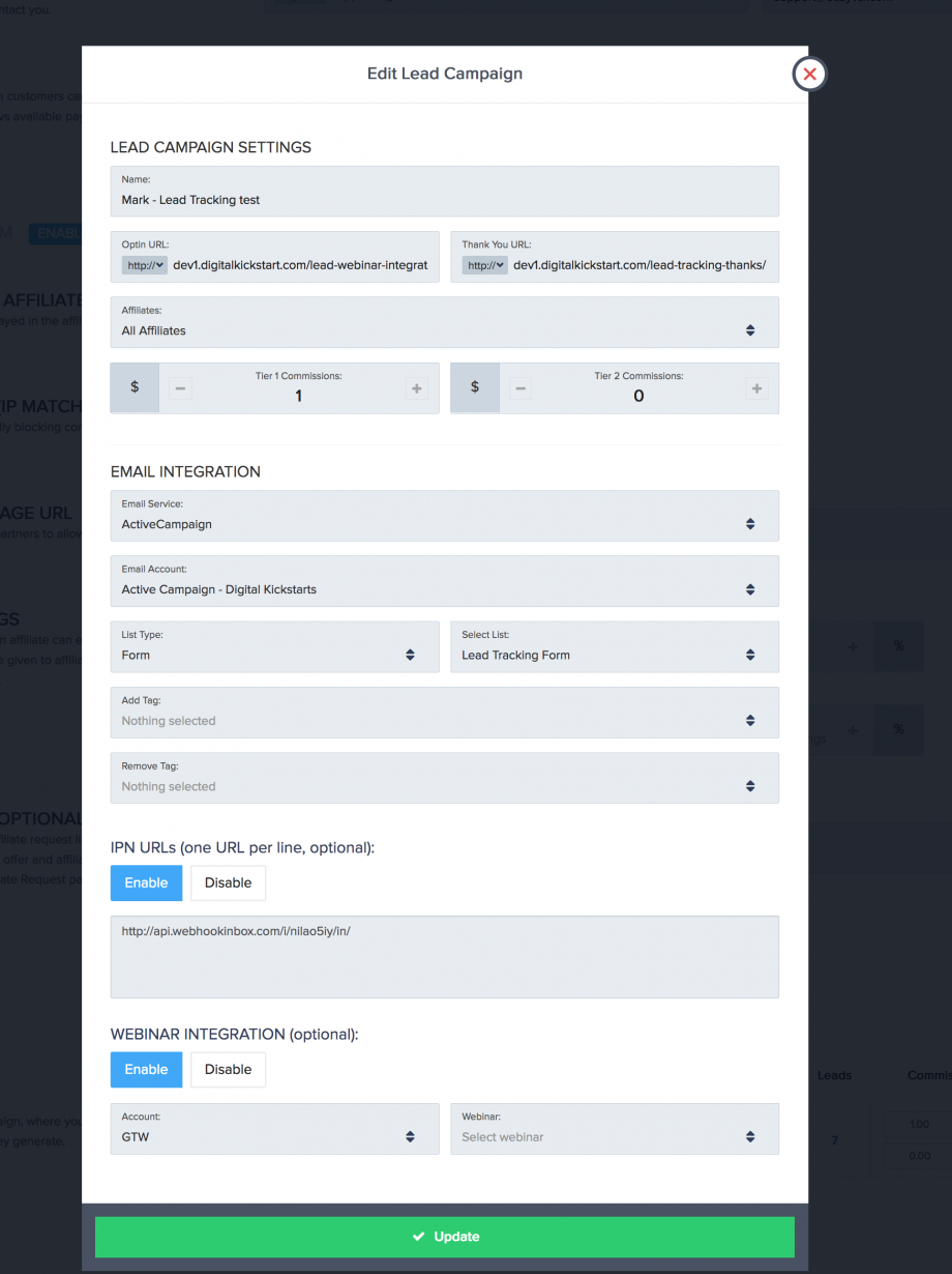 Finally, click the green add or update button to save the lead campaign settings.