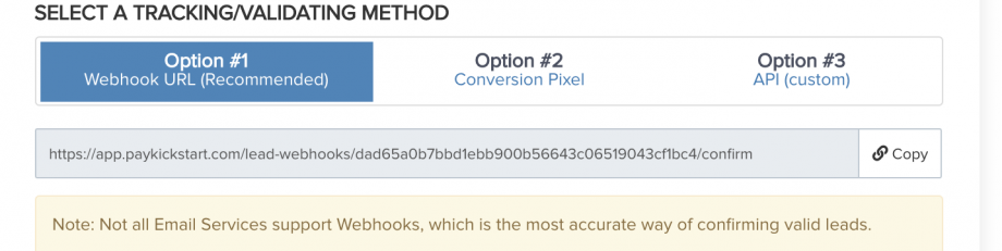 Then select and set up one of the tracking/validating methods. This is used to help confirm the lead in PayKickstart.