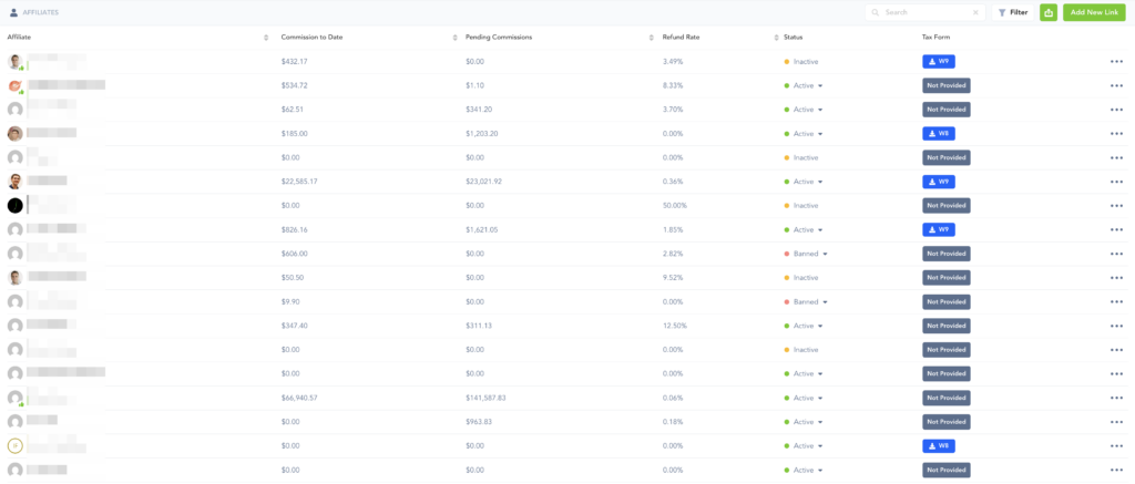 Filter, sort, or search for specific affiliates that you would like to manage.