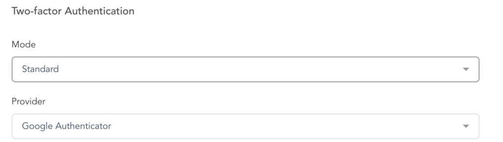 Next to the Two-Factor Authentication section, you will have the ability to choose the Mode and the Provider of your authentication code.