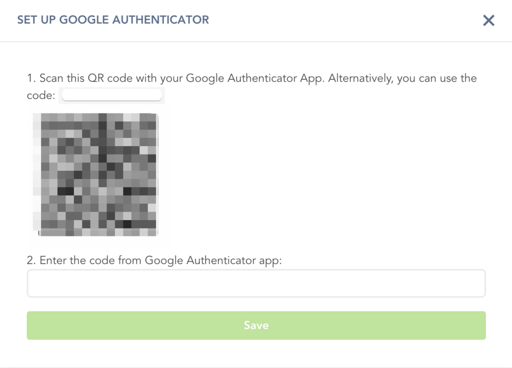 A pop-up will appear and you will be able to connect your Google Authenticator app via a unique QR code, or by entering the encrypted code you received into the app: