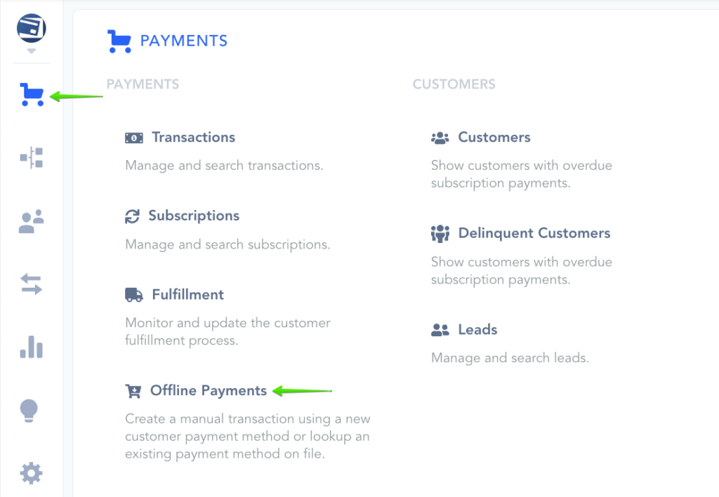 Go to the Payments Section in your Paykickstart account and select Offline Payments
