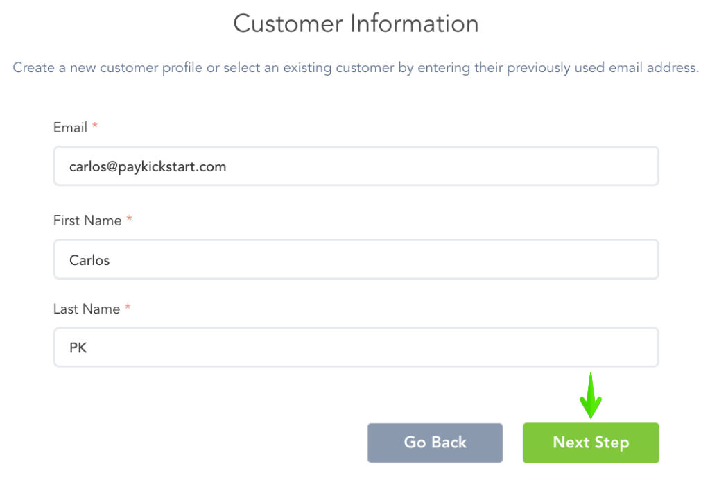 If the customer has already been saved in your Paykickstart account, you will have the option to select the customer’s account.
