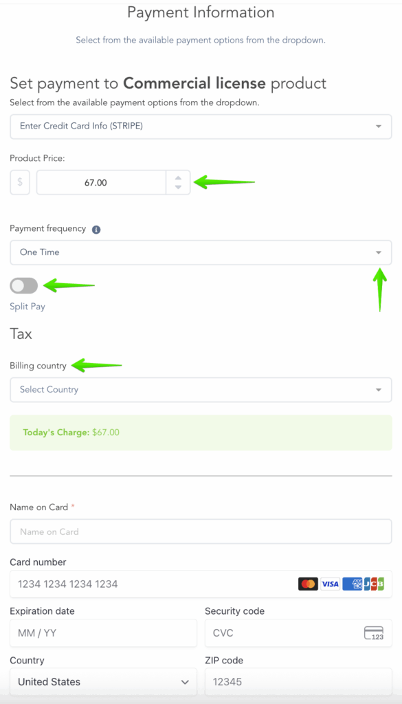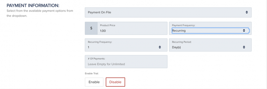 - Payment On File: If the customer has made a purchase from you before, you can select this option to run the previous payment information for the new charge. You will also have the option to structure the new payment being charged.