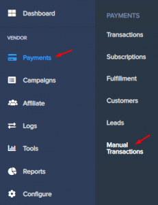 Step 1: Go to the “Payments” Section in your Paykickstart account and select “Manual Transactions”.