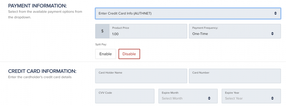 NOTE: If the manual offline payment transaction is for a subscription, rebill transactions will also run a manual offline payment. If you need to begin charging the customer via PayKickstart, please cancel the current subscription and run a manual transaction via Credit card or Payment on file - Credit Card Payment:(Via Select Payment Gateways) This option allows you to make a charge using the provided customer credit card information. *No card information will be stored on PayKickstart. Payment information will be sent to the connected payment gateway.