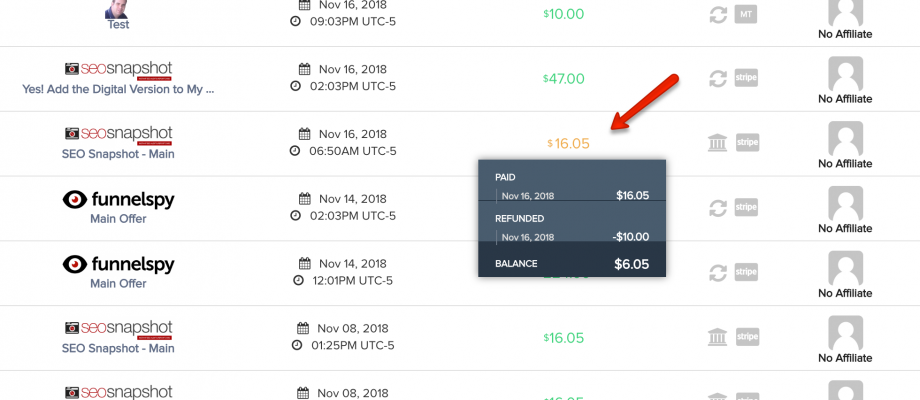 After you refund the sale, it will show up Orange, indicating that only part of the transaction has been refunded.  When you hover over the amount, it will show you a breakdown of whats been paid, refunded and the balance.