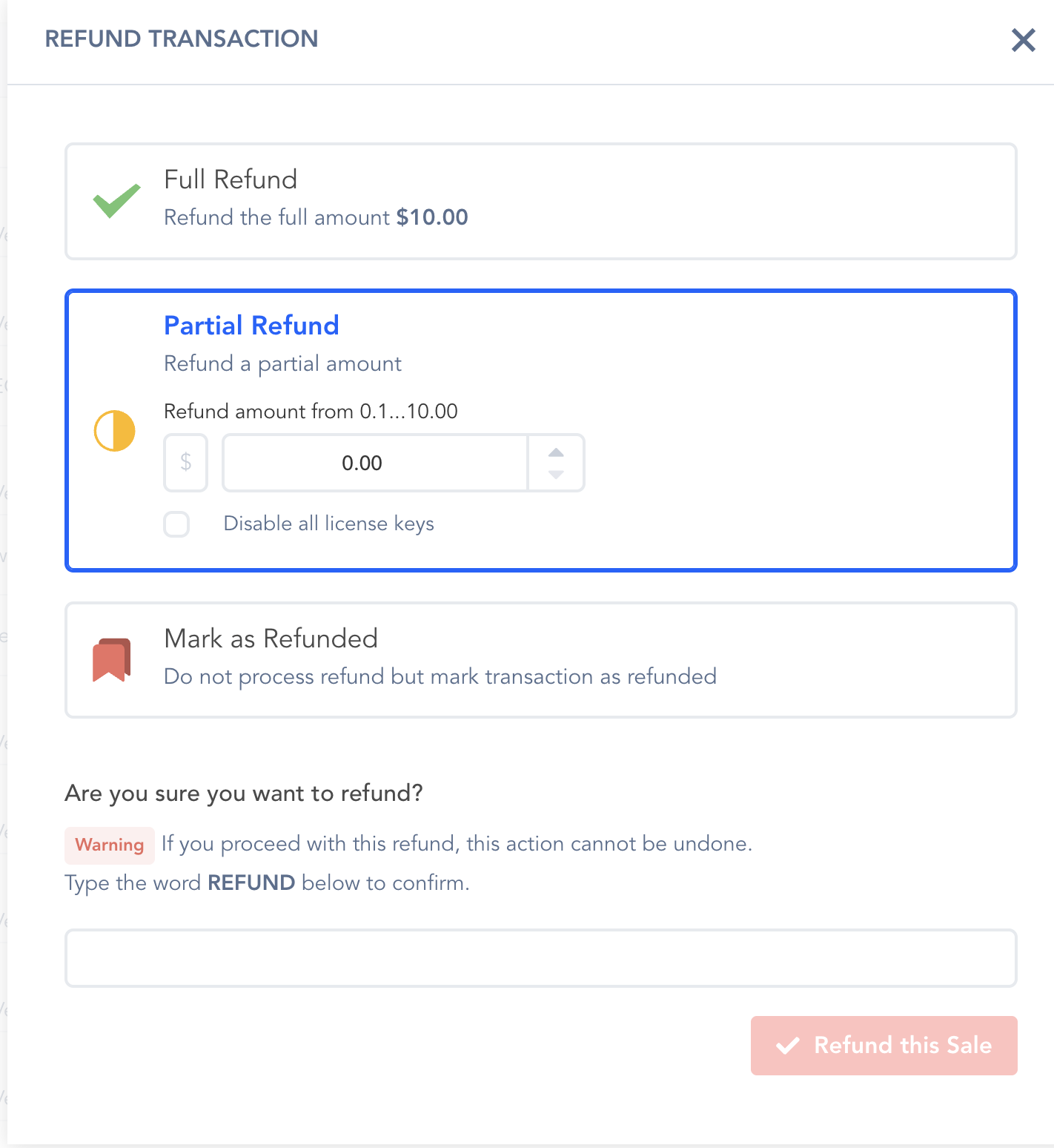 It will take you to a popup screen like below.  Click Partial Refund, enter the amount you would like to refund, type REFUND in the box, the click “Refund This Sale”.