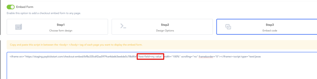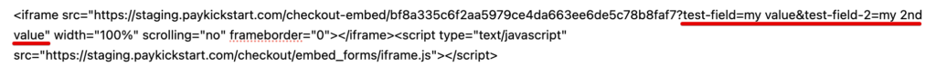 NOTE: You can also pass normal checkout field data to the checkout URL in the embed form. Click here to see the available variables: https://help.paykickstart.com/knowledge-base/pass-custom-variables-checkout-page-url/