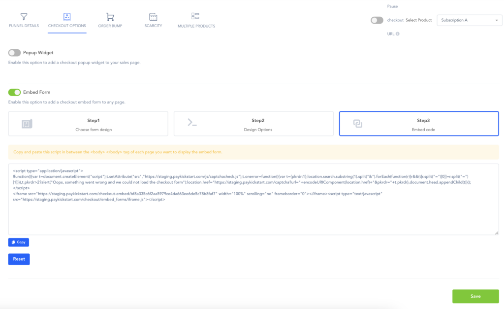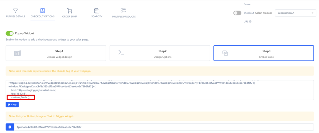 Go to the funnel settings the pop-up checkout is being used with and access the pop-up widget embed code.