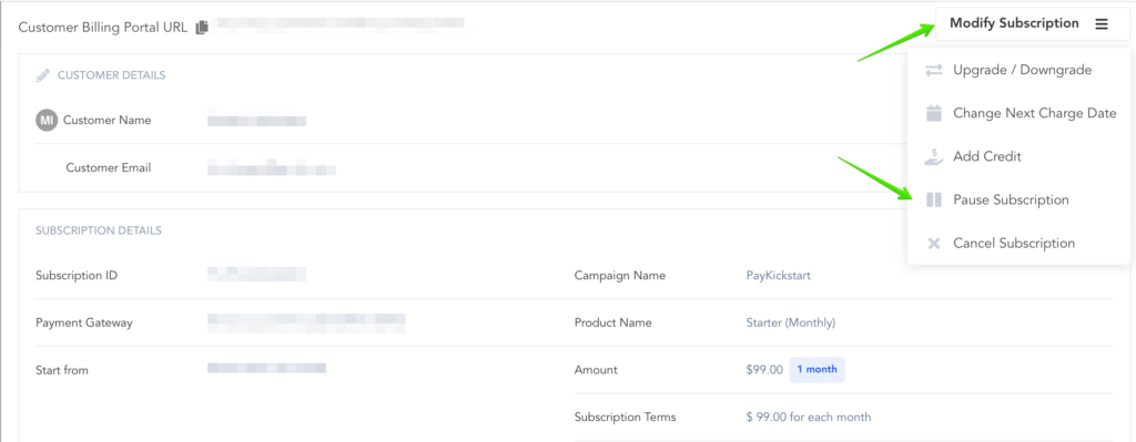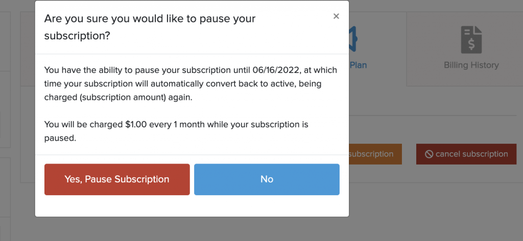 Once you’re sure everything is correct, click the Pause Subscription button to pause the customer’s subscription.