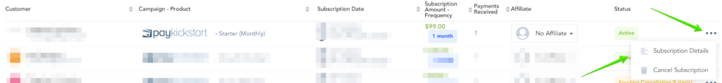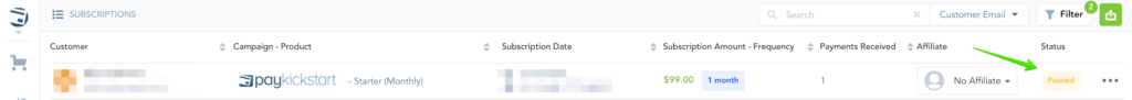 Paused Subscriptions will show in your Subscriptions dashboard with a filter status of “Paused”