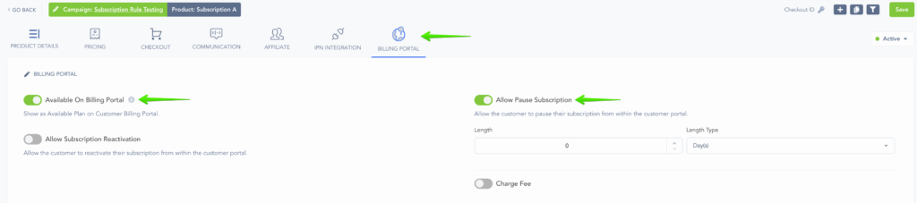 Under Billing Portal Section, Enable Available On Billing Portal, then Enable Pause Subscription.