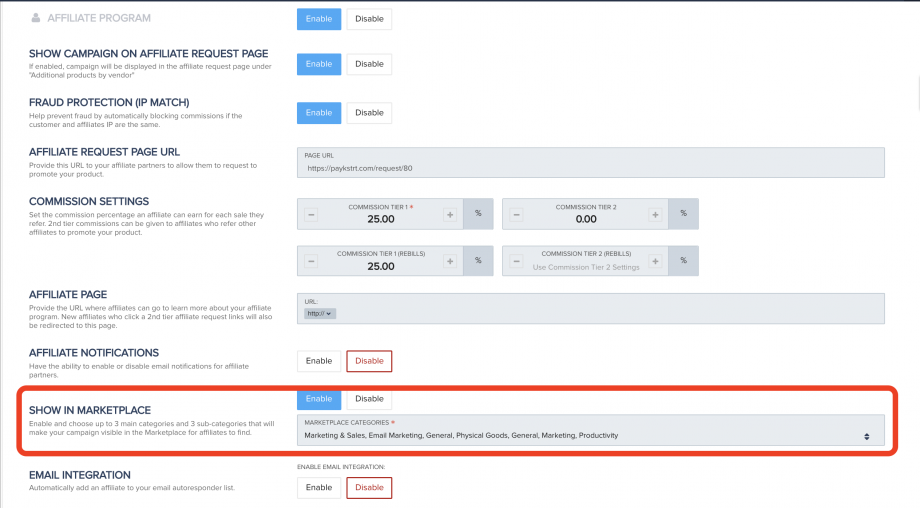In order for a vendor to add their Campaign to the Marketplace, they first must Enable it in the Campaign settings and pick which categories and sub-categories the product should be listed under.
