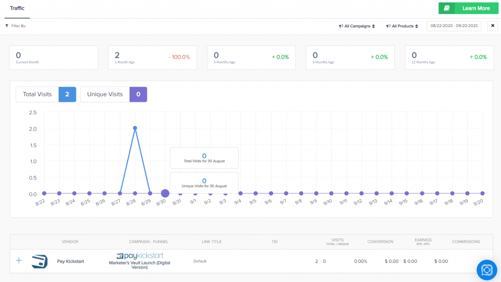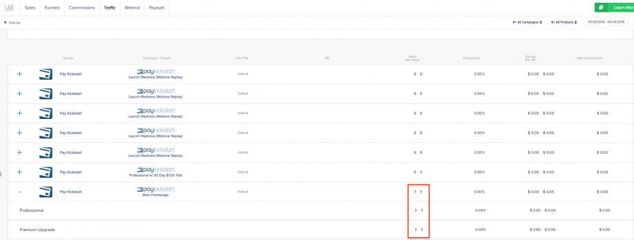 Each record represents traffic totals generated by the affiliate (visitor has the affiliate’s cookie set) for each of the vendor’s funnel’s products’ landing pages. It is also broken down by the state of the funnel (e.g. if the funnel structure changes in the selected date range, there may be more than 1 subset of data displayed for each funnel structure state.)