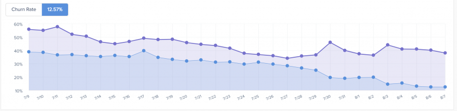Churn rate is calculated as follows: [ Count of all canceled subscriptions in 30 days prior to date x 100 ] / [ Count of active subscriptions 30 days prior to date ]