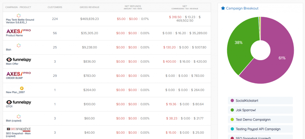 Gross Revenue: The total sales amount related to campaign/product before deducting refunds and commissions.