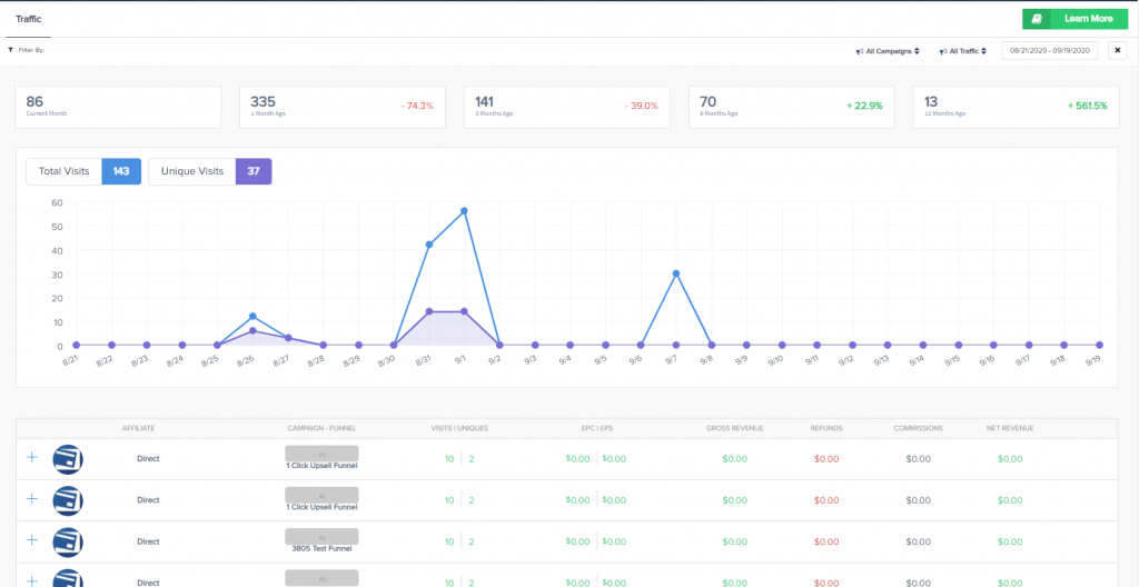 Traffic reports filter sales funnel traffic by Direct(no affiliate associated) and Affiliate related traffic on a all (or per) campaign basis. This includes traffic to campaigns which may have products in multiple funnels (i.e. if a campaign has products which exist in multiple funnels, the traffic from ALL funnels will be aggregated).