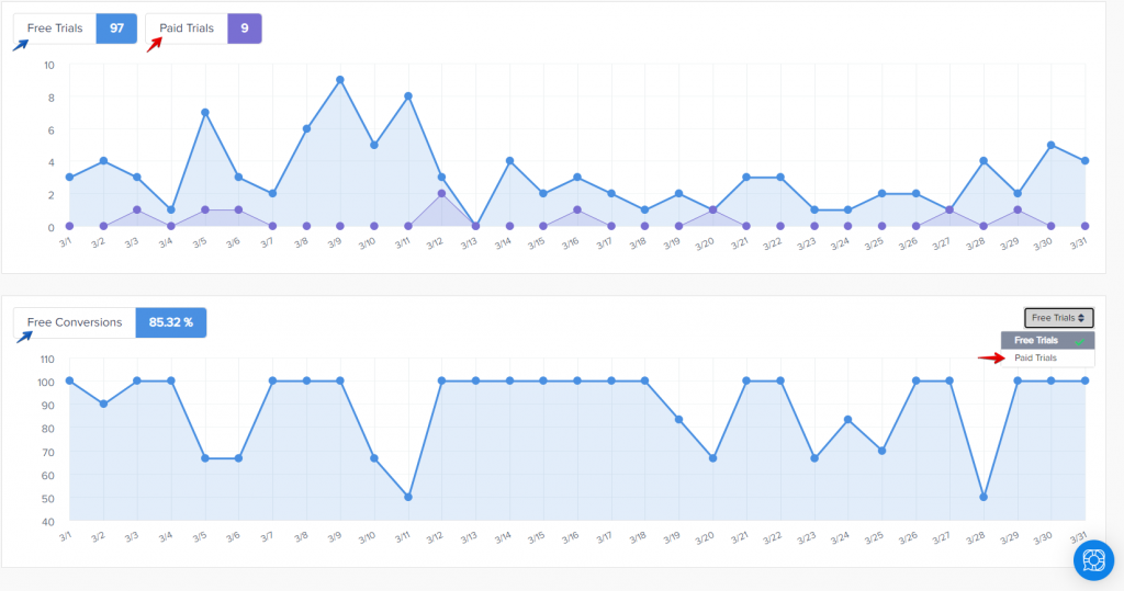 The Trial Subscriptions report shows the total number of trials started within the specified date range and the number of subscriptions that have matured (converted) either from Free or Paid Trials (if offered within your pricing structure).