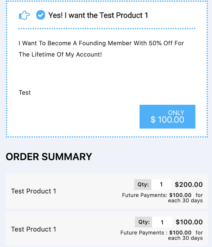 NOTE: This is not the final look of the checkout page, but rather a visual representation of what the final checkout page can look like with the different product settings available. Live checkouts will be located in the sales funnel section after adding the product to a funnel.