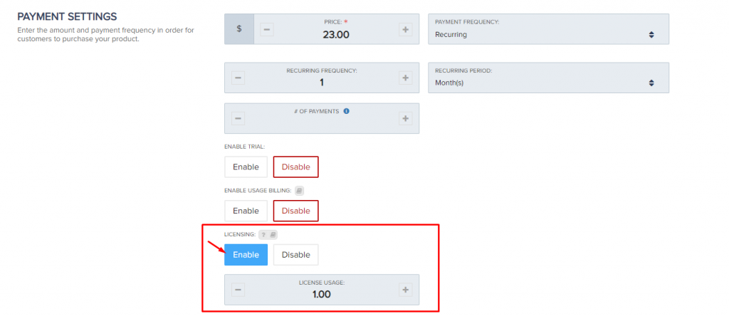 Step 2: Enable Licensing and specify the number of license keys to send to the customer. For example, if you have a desktop app and want the user to be able to install/activate the software on up to 3 computers, you would issue them 3 license keys.