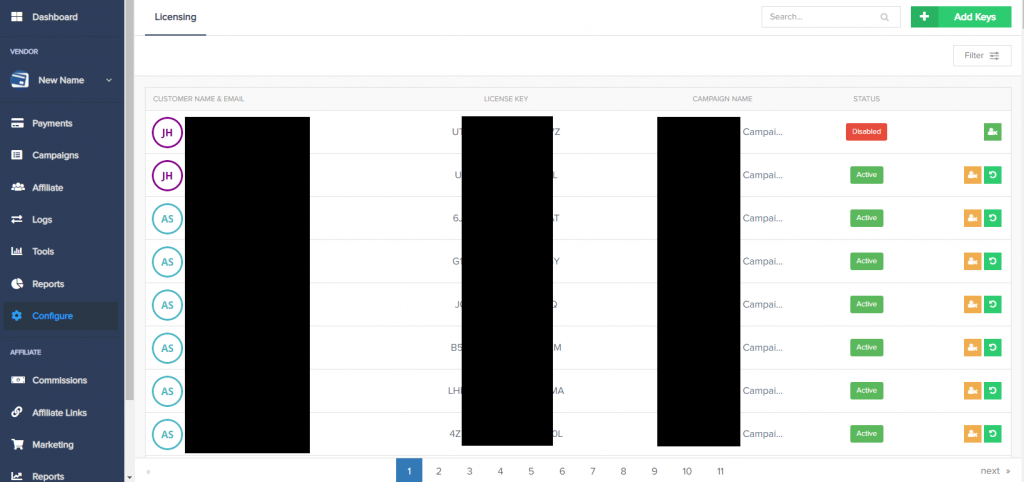 Step 4: The license keys will automatically be created upon purchase of the product. To manage license keys you will click on “Configure” >> “Licensing“. This area is used to override license key statuses.