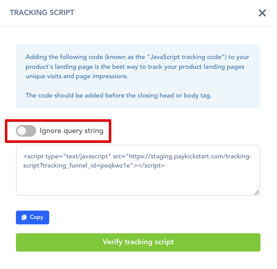 In the example case above, if you do not enable the “ignore query string” option, the Paykickstart tracking script will attempt to match the entire URL including the added tracking fields as your landing page URL, and since that is not actually your landing page’s URL, it will fail to record that traffic.