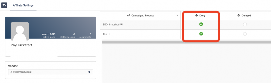 - Affiliate is set to ’deny” for the related campaign: In the affiliate profiles section in your vendor account, if the affiliate is set to deny for the related campaign, they would no see links related to that campaign.