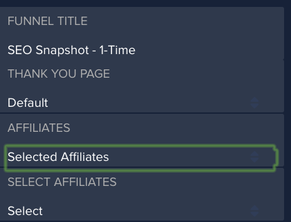 - Sales Funnel is set to no or select affiliates: If a sales funnel is set to “no affiliates”, then no affiliates will have access to the related affiliate link. If the sales funnel is set to “select affiliates”, then only the affiliates selected will have access to the related affiliate link for the funnel.
